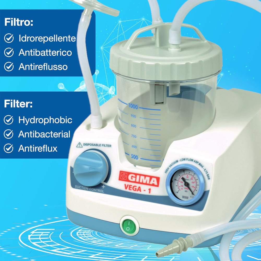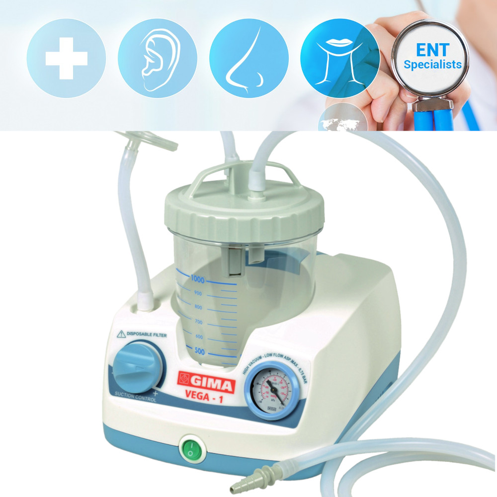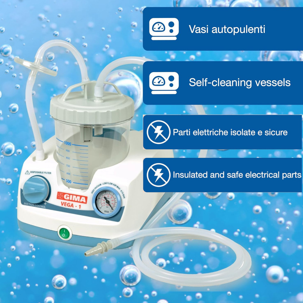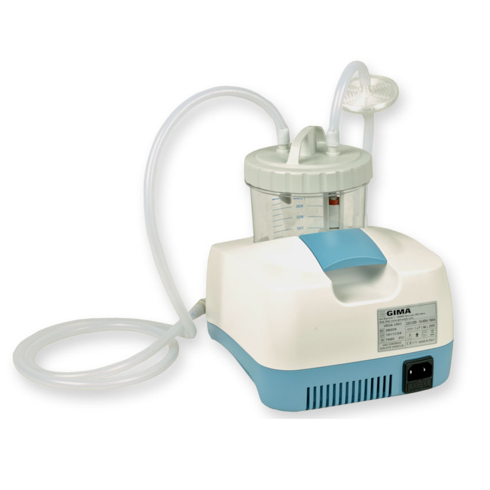Aspirator medical Vega Uno compact si fiabil, ideal pentru aspiratie nazala, orala si traheala la adulti sau copii. Aspirator chirurgical ORL, debit 15 l/min, recipient autoclavabil 1L, functionare silentioasa si continua. Fabricat în Italia. Aspiratoare chirurgicale Vega Uno elegante, compacte si fiabile pentru interventii chirurgicale minore sau post operator. Aspiratorul medical Vega Uno portabil, fabricat în Italia, pompa silentioasa cu debit ridicat si aspiratie continua, fluidelor corporale (mucus, secretii sau sange).