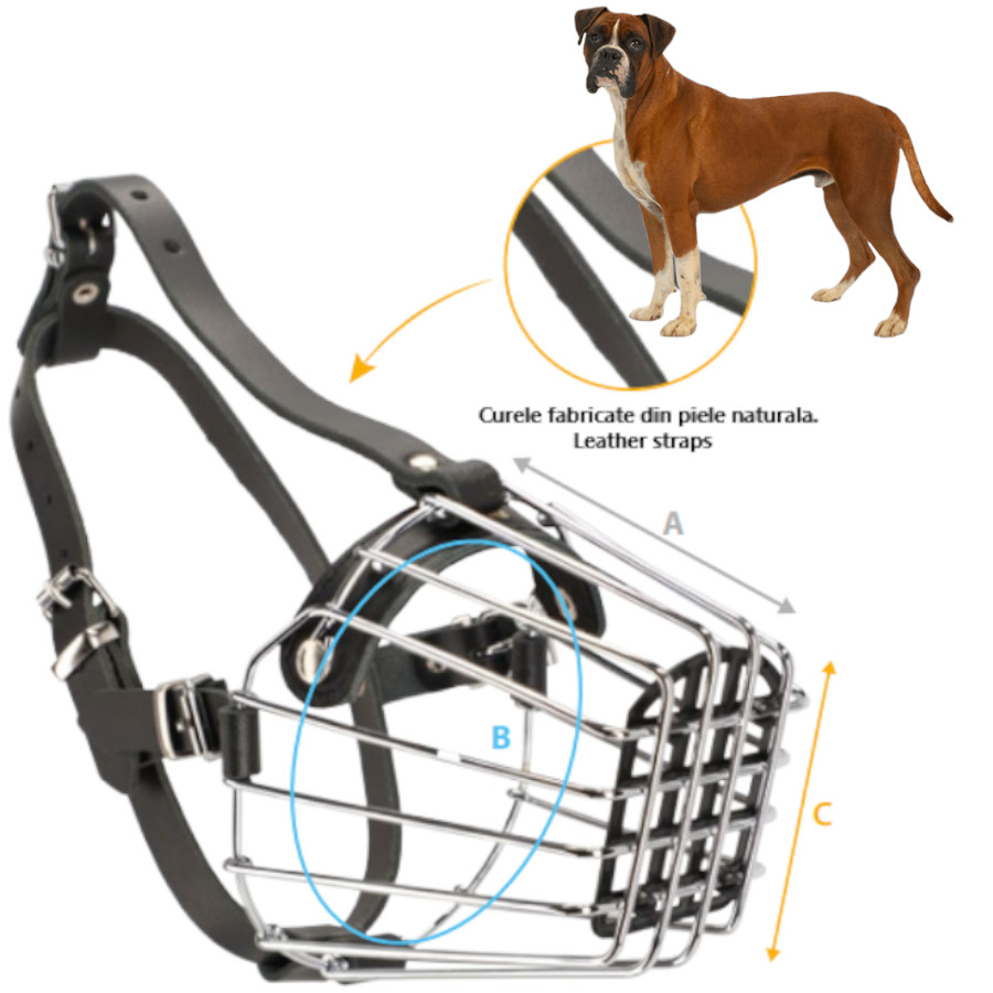 Botnita profesionala pentru caine Boxer este realizata din piele naturala si fire metalice cromate, fiind nituita si captusita cu material moale pentru un confort sporit. Botnita profesionala, ofera siguranta si control, fiind ideala pentru cainii din rasa Boxer de talie mare sau cu o morfologie asemanatoare.