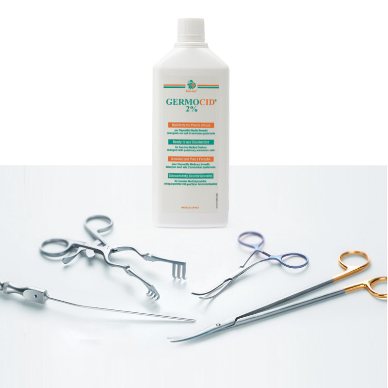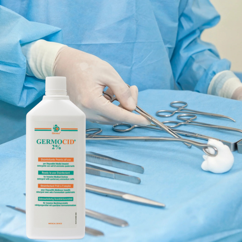 Dezinfectant profesional pentru instrumentar medical si chirurgical. Germocid® 2% flacon 1 litru, solutie gata de utilizare, cu actiune detergenta si dezinfectanta, conceputa special pentru dispozitive medicale invazive si instrumentar chirurgical. Ideal pentru decontaminarea si dezinfectia de nivel înalt înainte de sterilizare, acest produs ofera eficienta maxima chiar si în prezenta materialelor organice (sange, saliva, exsudate).