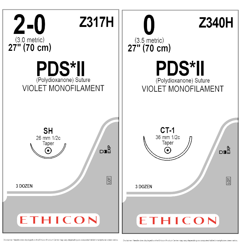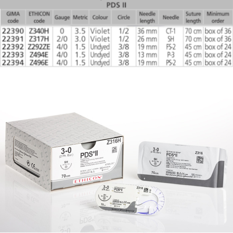 • 22391 Fire sutura Ethicon™ PDS II Z317H, USP 2/0, metric 3.0, ac 26 mm, SH, curbura 1/2, lungime sutura 70 cm, cutie 36 buc