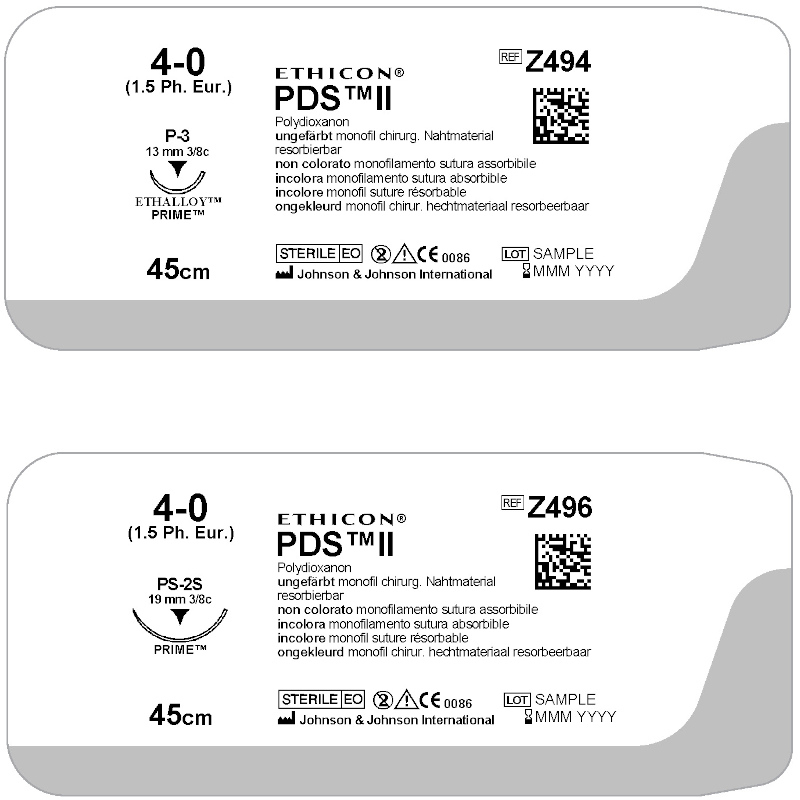 • 22394 Fire sutura Ethicon™ PDS II Z496E, USP 4/0, metric 1.5, ac 19 mm, PS-2, curbura 3/8, lungime sutura 45 cm, cutie 24 buc