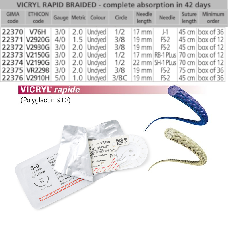 - 22372 Fire sutura Ethicon™ Vicryl Rapide V2930G, USP 3/0, metric 2.0, ac 19 mm, FS-2, curbura 3/8, lungime sutura 45 cm, cutie 12 buc