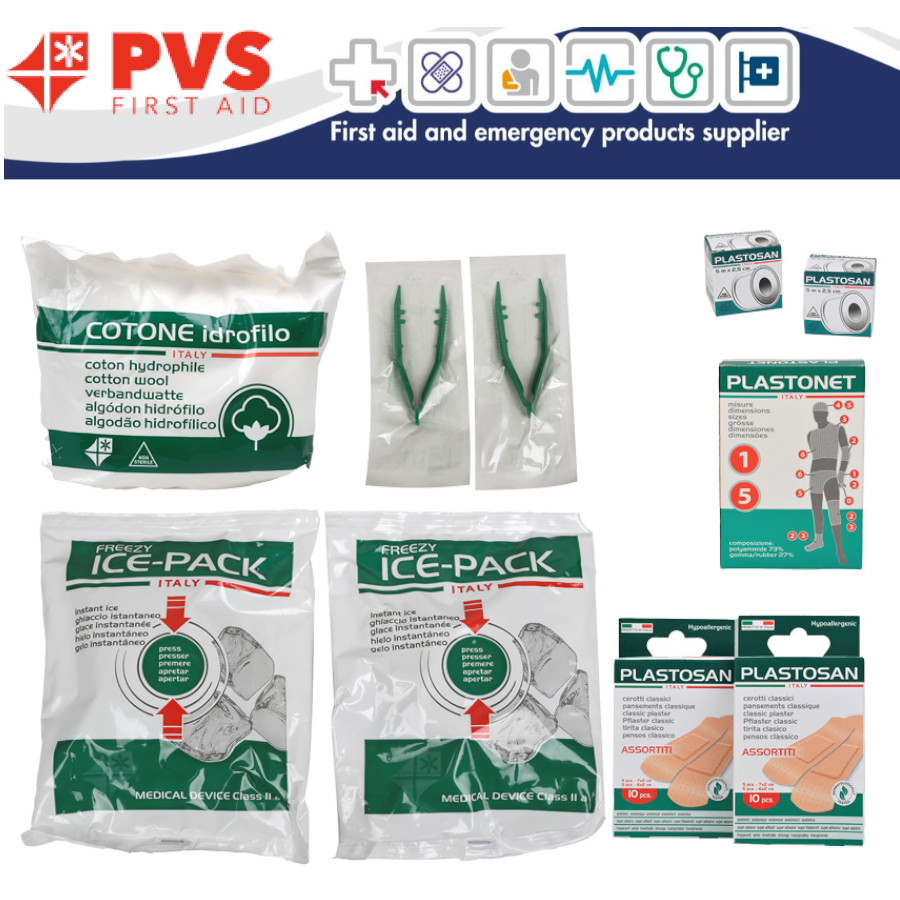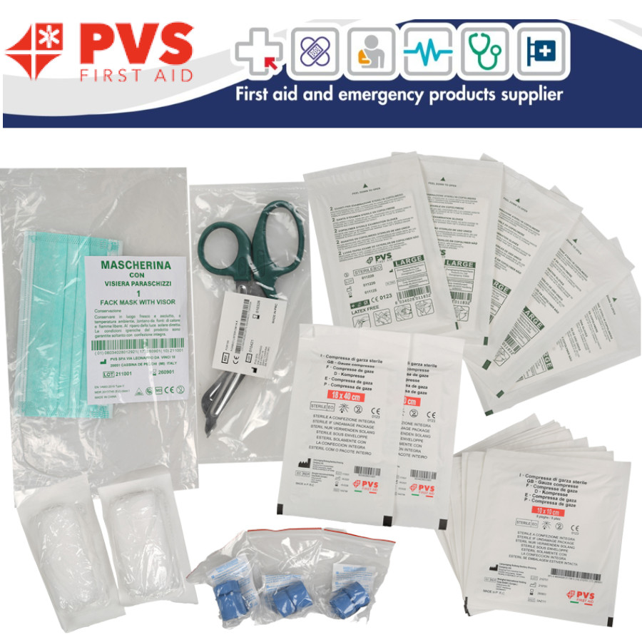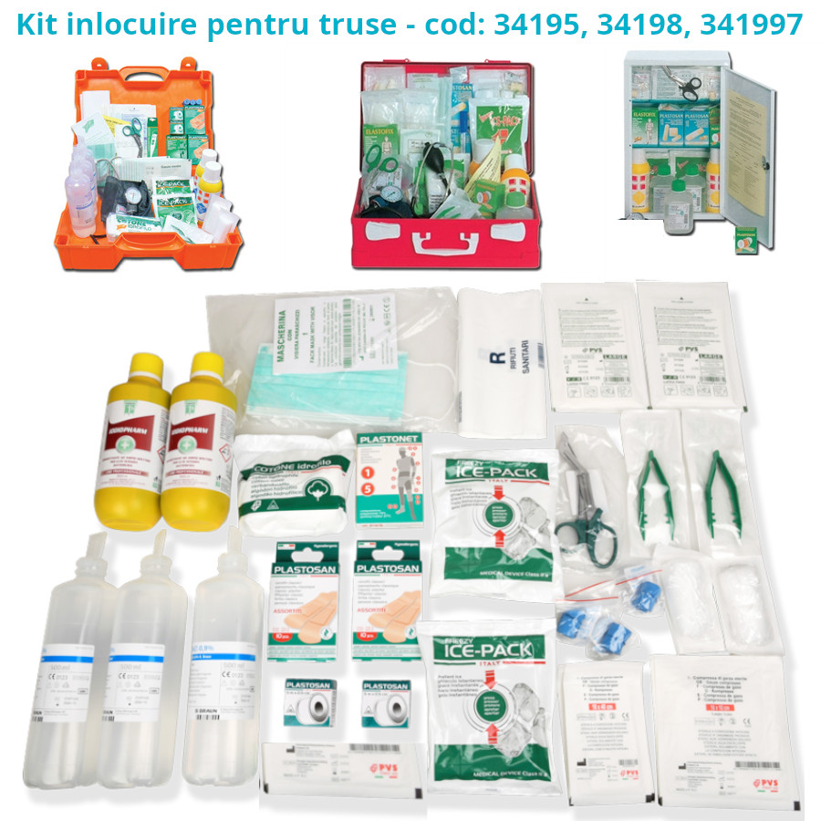 Kit profesional de inlocuire truse sanitare de prim ajutor Gima - cod 34195, 34198 si 34199. Kit inlocuire trusa medicala de prim ajutor, set complet de consumabile medicale sterile si produse sanitare esentiale pentru siguranta maxima in centre medicale, spitale, cabinete medicale, medicina de famile, medicina muncii, etc.