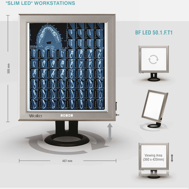 Negatoscop slim model de birou generatie noua, iluminare cu LED, temperatura de culoare de 7.200 ° Kelvin pentru vizualizarea si citirea usoara a radiografiilor. Iluminarea cu LED elimina complet palpairea luminii, asigurand o iluminare uniforma, 3500 cd/m2.