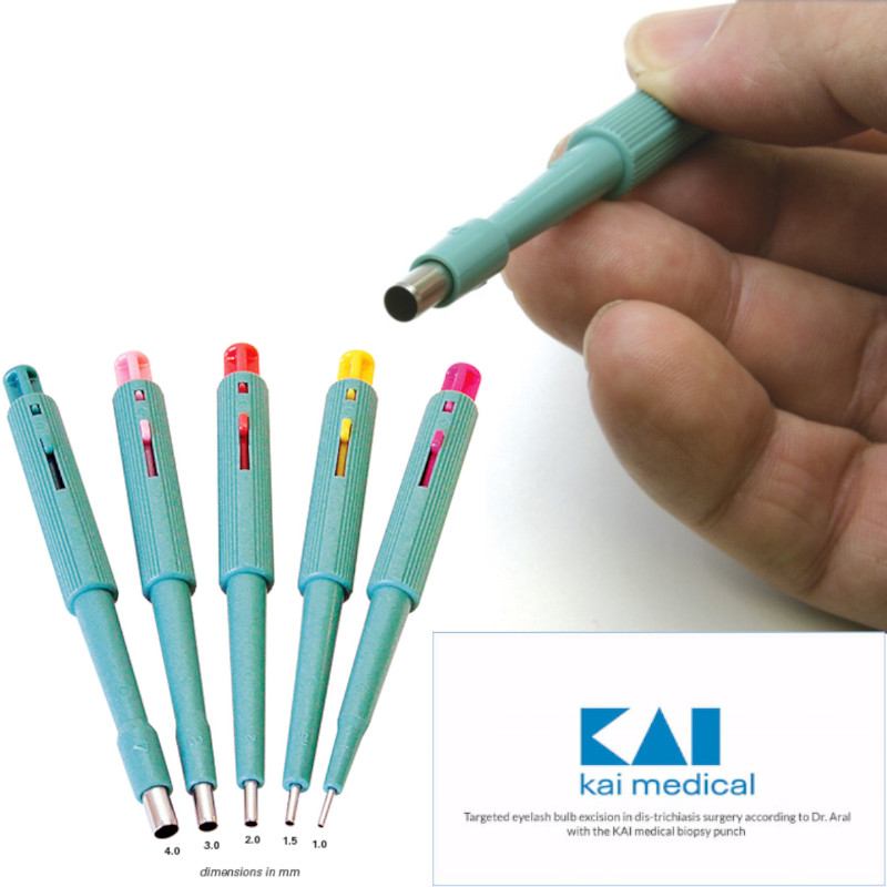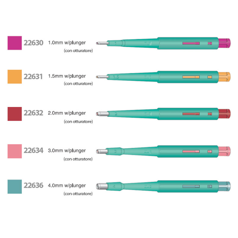 Pense pentru biopsie de unica folosinta Punch cu piston, cutie 20 buc, steril, ambalat individual, tais dublu din otel inoxidabil, fara striatii, pentru taiere neteda, maner cu nervuri pentru siguranta prinderii, dimensiuni diferite. Pense Punch pentru biopsie recomandate pentru utilizarea in dermatologie, ginecologie, cosmetica, etc. Dimensiuni disponibile pense punch: de la Ø 1 mm la Ø 8 mm. cu lungime lama de 7 mm.