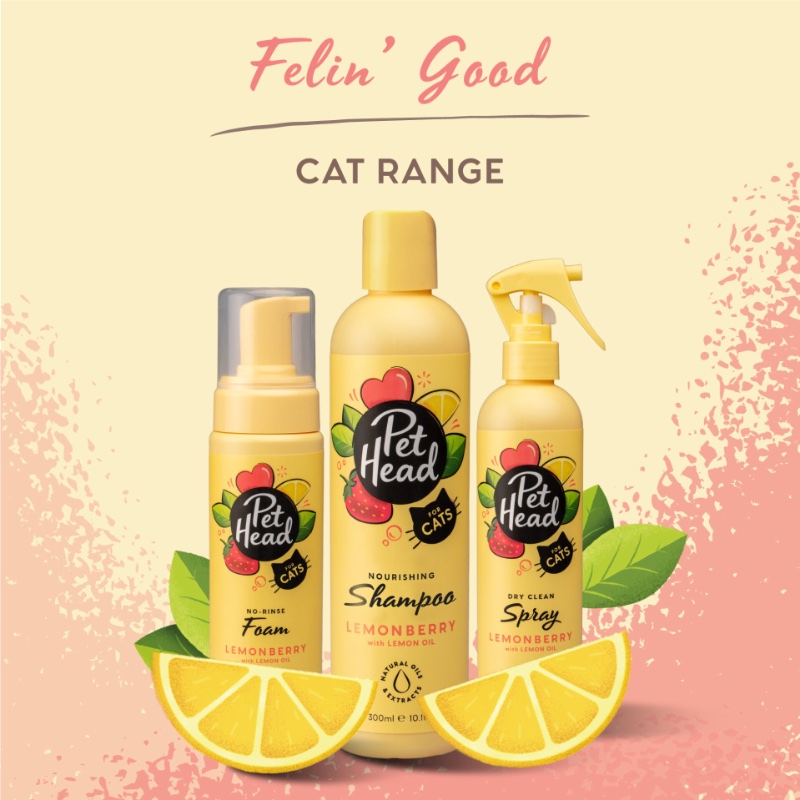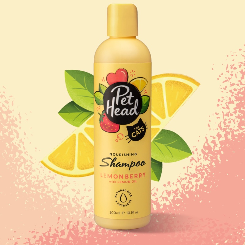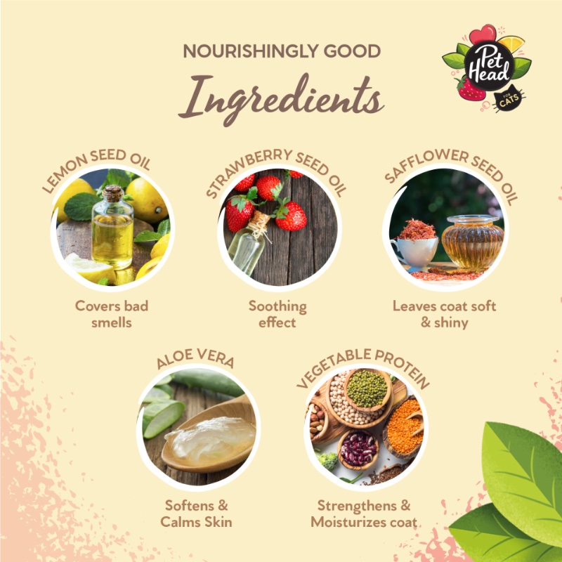 Samponul Pet Head cu parfum proaspat de lamaie si capsuni este special creat pentru pisici, oferind o curatare delicata si hranitoare. Formula contine ulei din seminte de lamaie, care neutralizeaza mirosurile neplacute, ulei din seminte de capsuni pentru hranirea firelor de par, ulei din seminte de sofranel pentru hidratare si inmuierea blanitei, precum si extract de aloe vera pentru un plus de stralucire si catifelare.